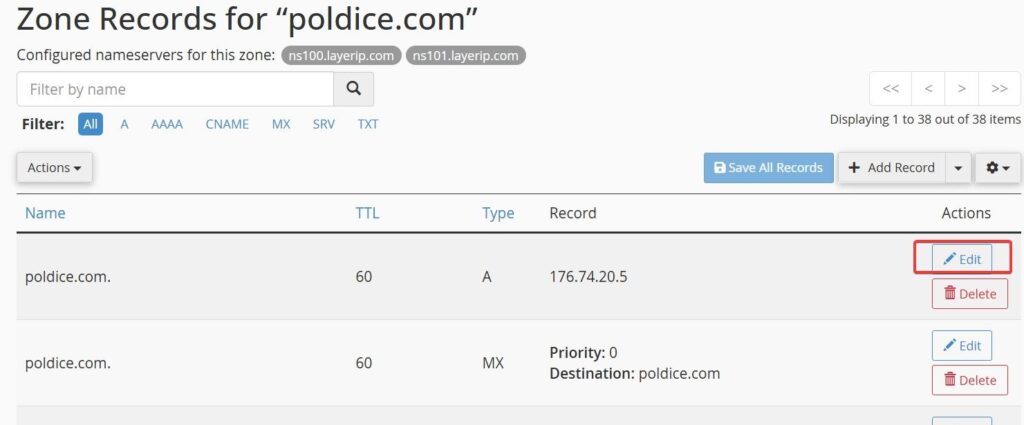 1. In the Zone Editor, locate your domain and click Manage.