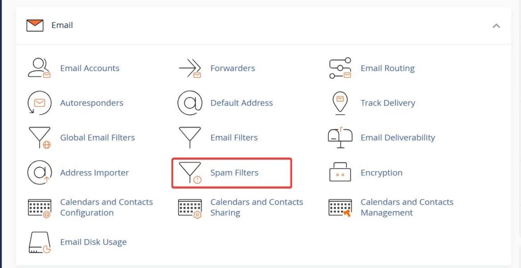 - Scroll down to the Email section and click on Spam Filters..