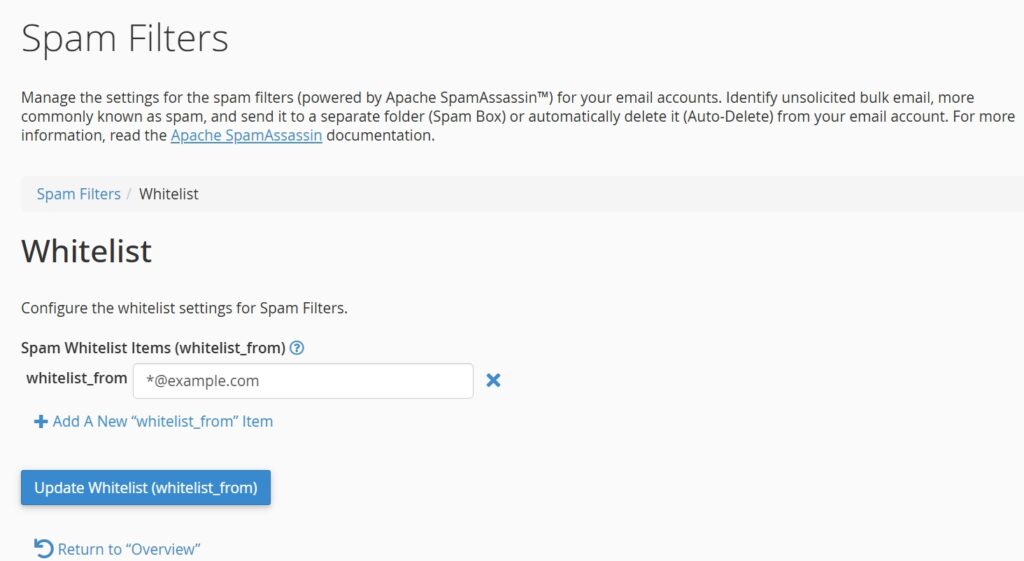 Note: Whitelisting an entire domain allows all emails from that domain to bypass spam filters. Use this with caution.