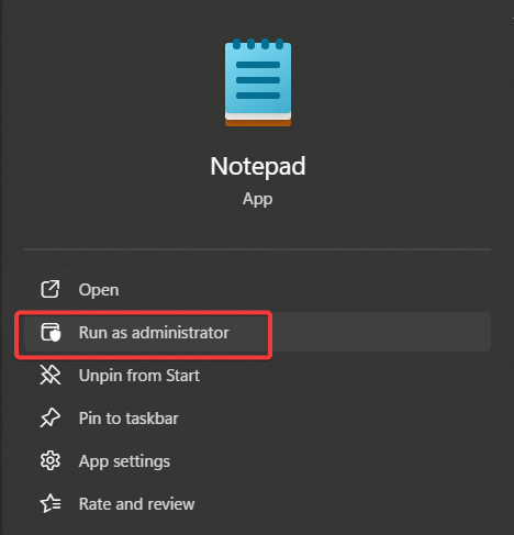 - Right-click Notepad → Select “Run as administrator”