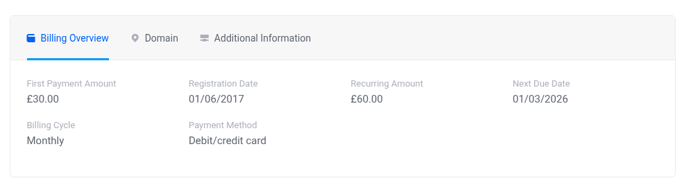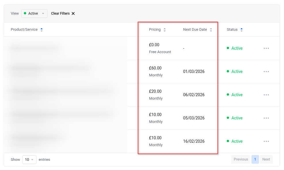 You will see a table of your services, including the product name, primary domain, billing cycle, price and next due date.