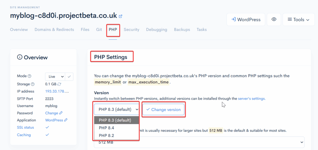 • Once changed, your site will begin using the new PHP version right away.