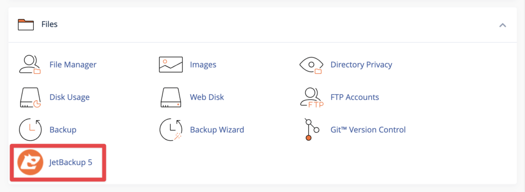 Step 2. Scroll to the Files section and click JetBackup, or use the search bar at the top of cPanel to find it.