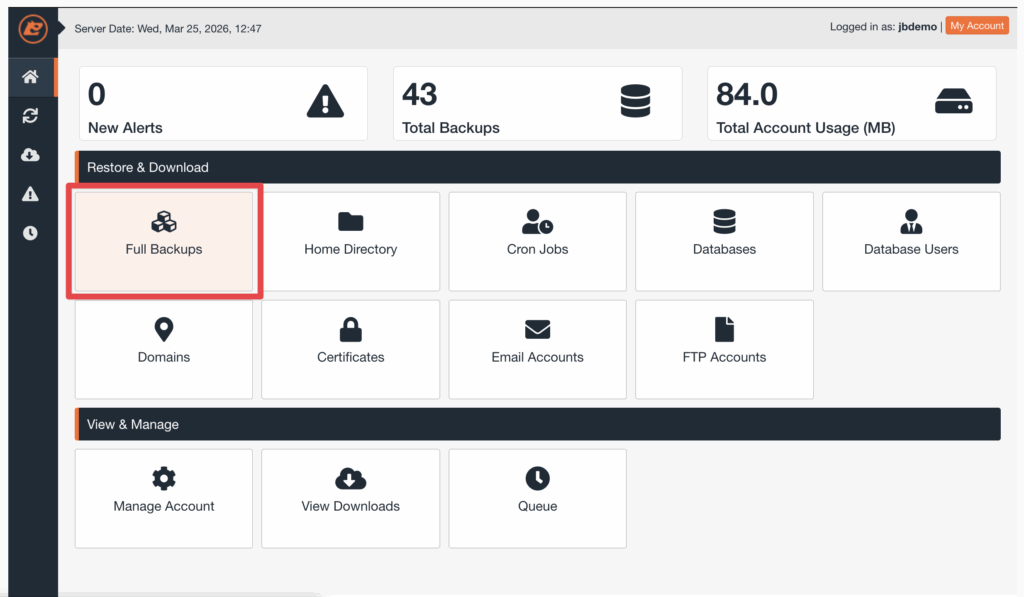 Step 1. From the JetBackup dashboard, click the Full Backups icon.