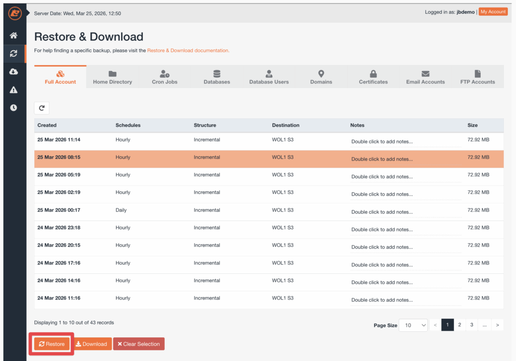 JetBackup maintains automatic backups of your hosting account, including files, databases, email accounts, cron jobs, DNS zones, and SSL certificates. You can restore any of these from a previous backup point, or download a copy to keep locally.