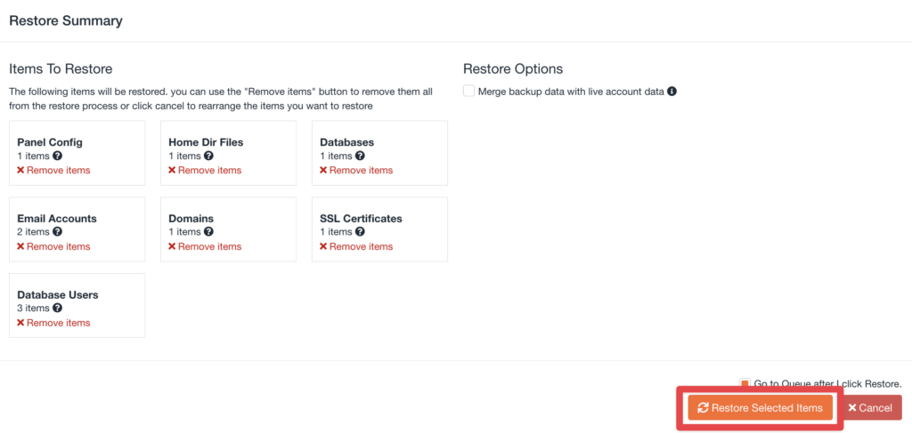 You don’t need to run a full account restore to recover a single component. JetBackup lets you restore each of the following independently: