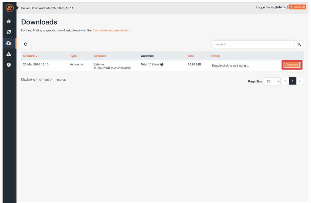 The process is the same as restoring — select the account and backup date as described above, but click Download instead of Restore. Confirm with Download Selected Items, then check the Queue for progress. Once the job shows Completed, go to the Downloads tab to save the archive to your local device.
