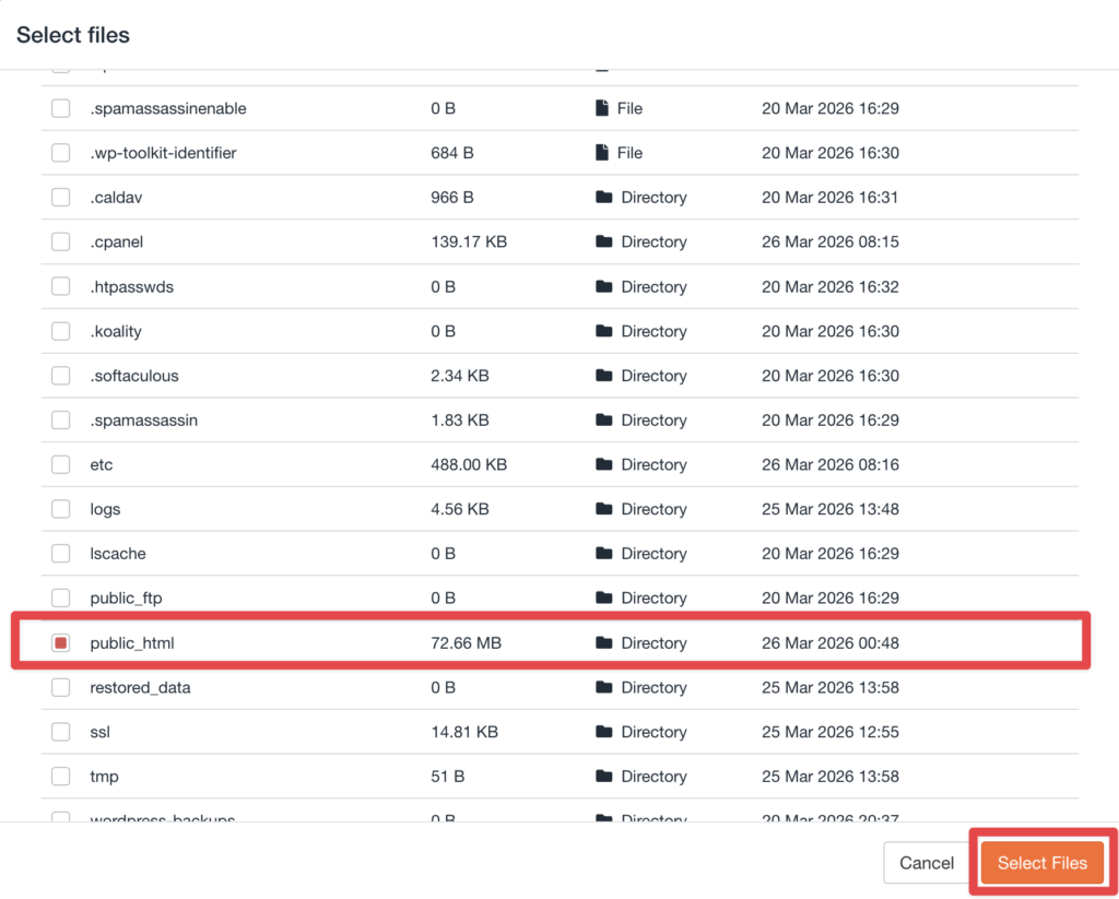 Step 3. A file browser will open showing the contents of your home directory as it was at the selected backup date. Tick the boxes next to the files or directories you want to restore, then click Select Files.