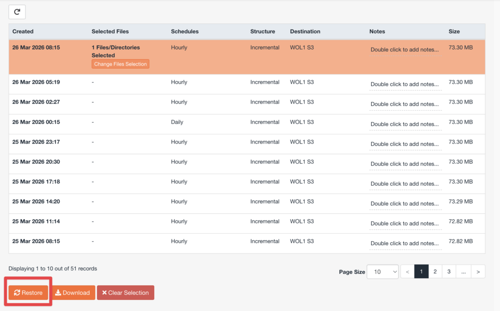 The process is the same as restoring — select the backup date, choose your files via Change File Selection, but click Download instead of Restore. Confirm with Download Selected Items, then check the Queue for progress. Once the job shows Completed, go to the Downloads tab to save the archive to your local device.