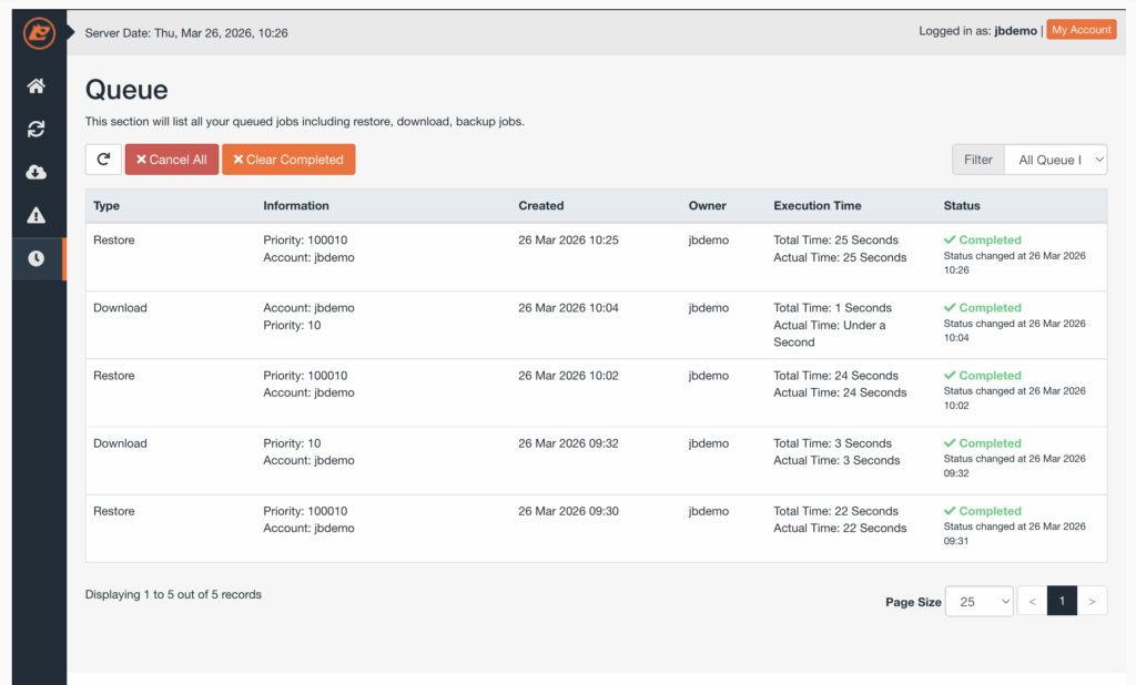 Step 6. The restore job will be queued. Click the Queue button on the JetBackup dashboard to monitor progress. The job will show a status of Completed once the files have been restored.