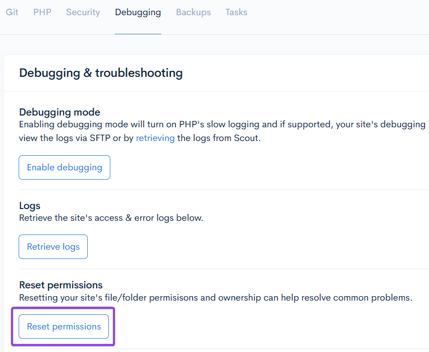 If resetting permissions didn’t solve it, the Debugging section has other tools worth exploring. They’re all one-click solutions like this one.
