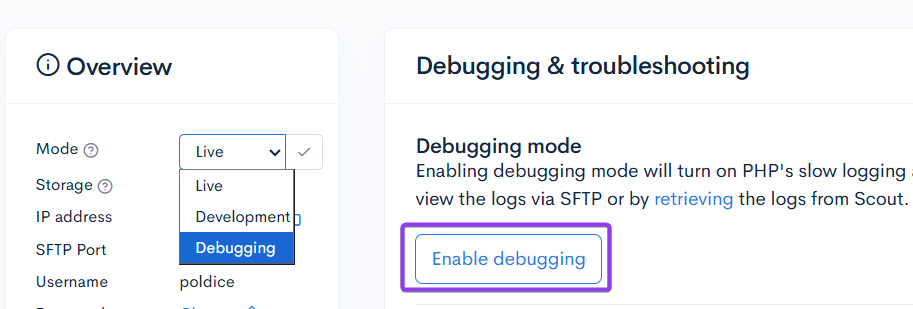 If you’re actively troubleshooting, consider switching your site from “Live” to “Debugging” mode before testing again. This disables server-side caching and gives you a clearer, more up-to-date view of how your site actually behaves.