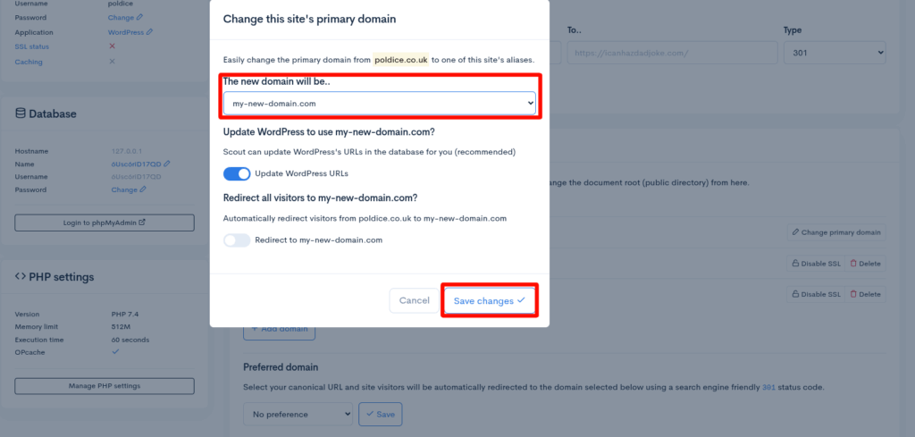 - Select the new domain from the drop down, then click Save changes.