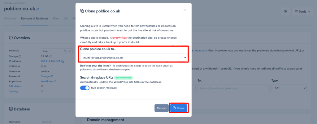 - Select the new site you wish to clone to from the drop down, then click Clone.