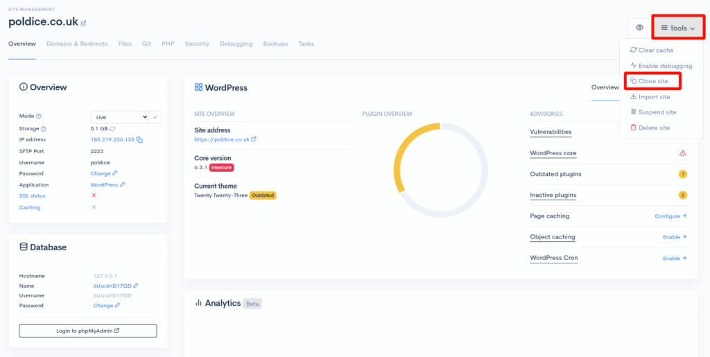 - Select Clone site from the Tools drop down.