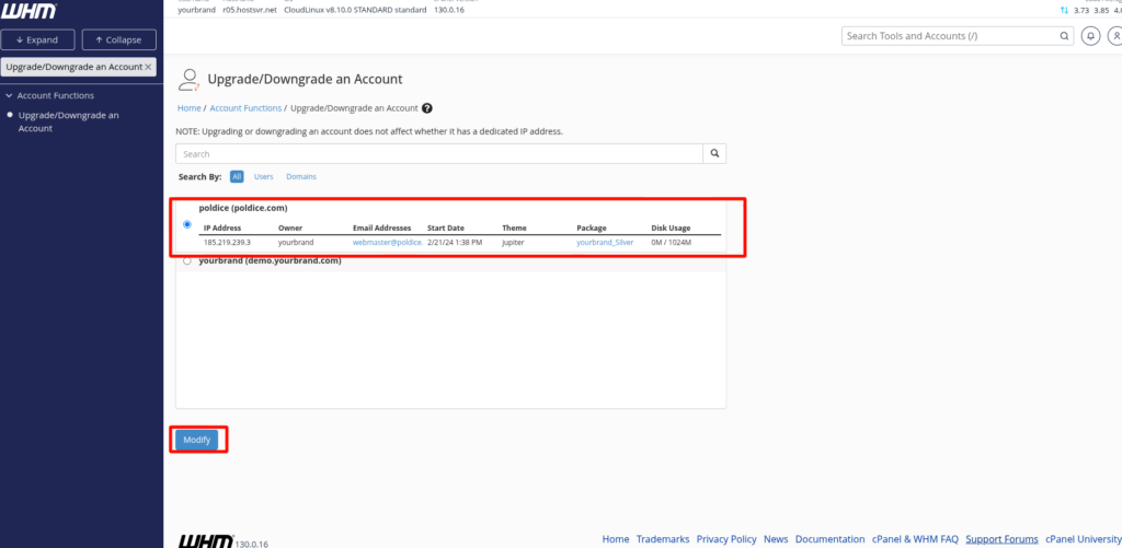 That’s it, you’ve now Upgraded/Downgraded an Account by changing the Package assigned to the cPanel account.